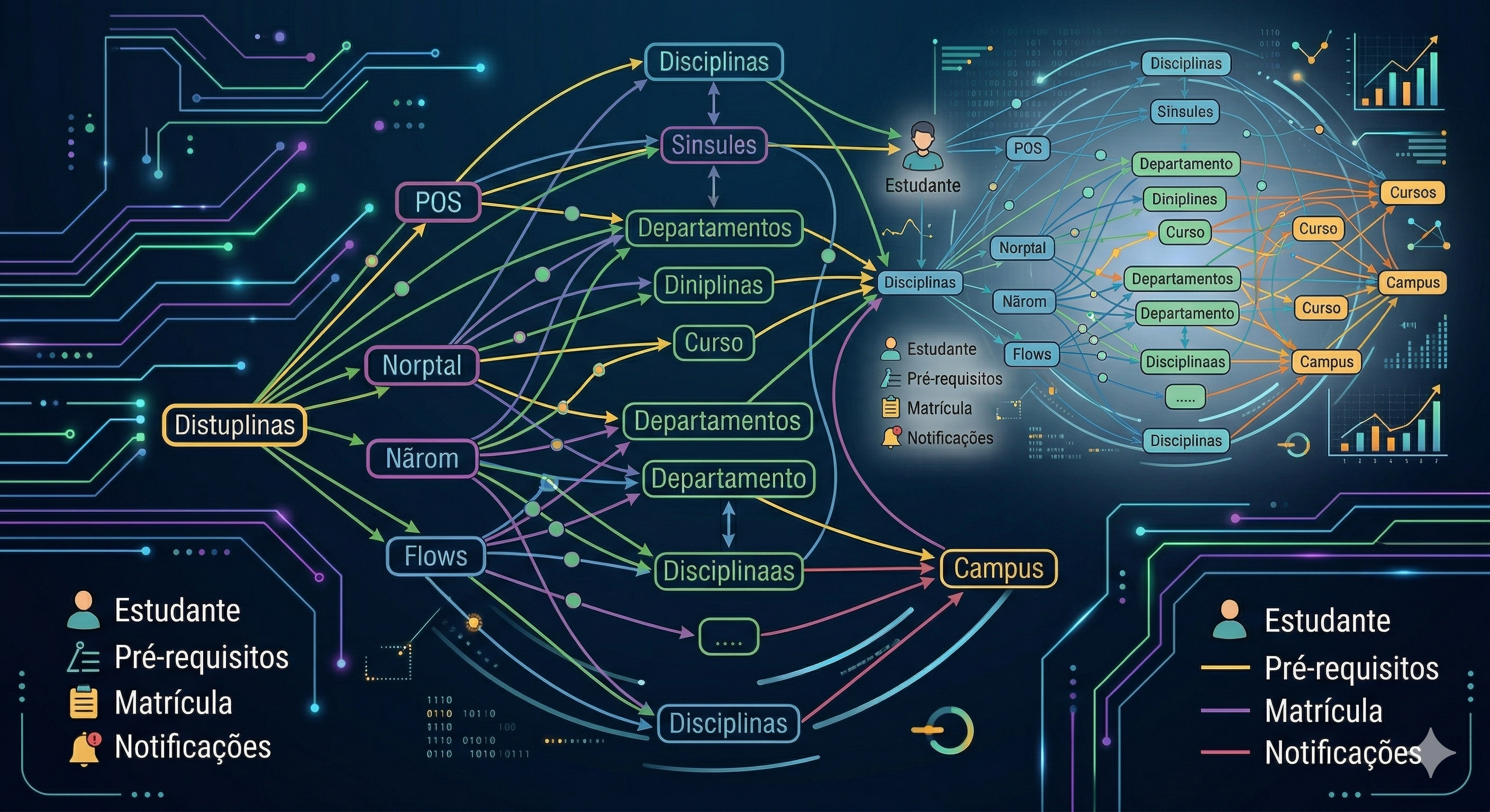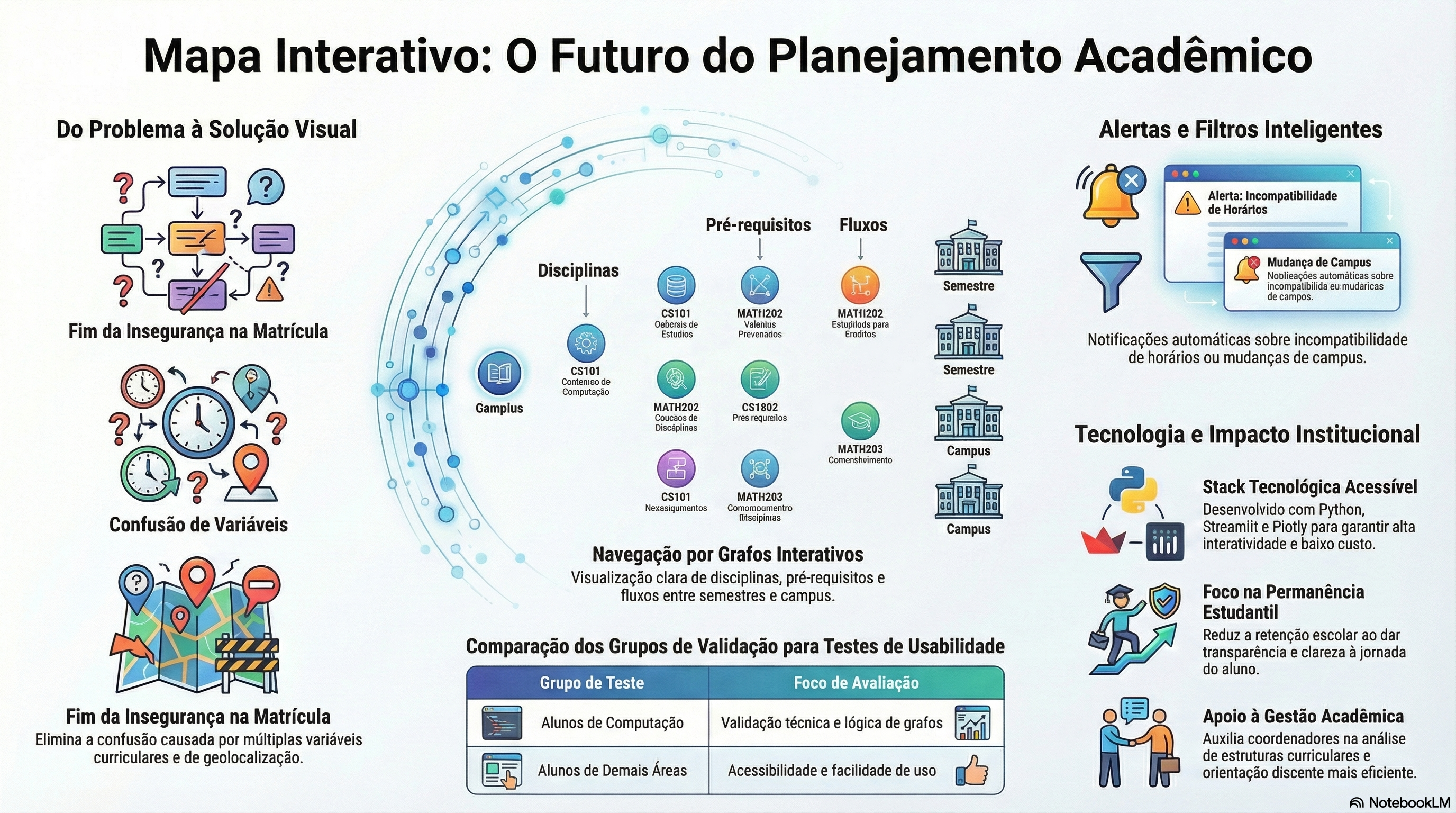Problema de pesquisa: A ausência de uma visualização integrada com as inúmeras variáveis de matriz curricular e de geolocalização reduz a eficiência do planejamento acadêmico e aumenta a insegurança do estudante diante das decisões de realização de matrícula em todos os períodos acadêmicos. Metodologia proposta: A metodologia envolve coleta e organização de dados curriculares, modelagem das relações entre disciplinas em grafos, apoio ao desenvolvimento de uma aplicação visual interativa com filtros e buscas, além de documentação contínua. Também inclui testes com usuários, avaliação da ferramenta, consolidação de feedbacks e produção de relatórios e materiais de divulgação do projeto. Resultados esperados: A solução tem aplicação direta no ensino superior, auxiliando estudantes no planejamento da matrícula, na compreensão de pré-requisitos, na organização por semestre e na visualização de trajetórias curriculares. Também pode apoiar coordenadores, docentes e setores acadêmicos na orientação discente e na análise da estrutura curricular. Institucionalmente, contribui para permanência estudantil, redução de retenção e maior transparência das informações acadêmicas.